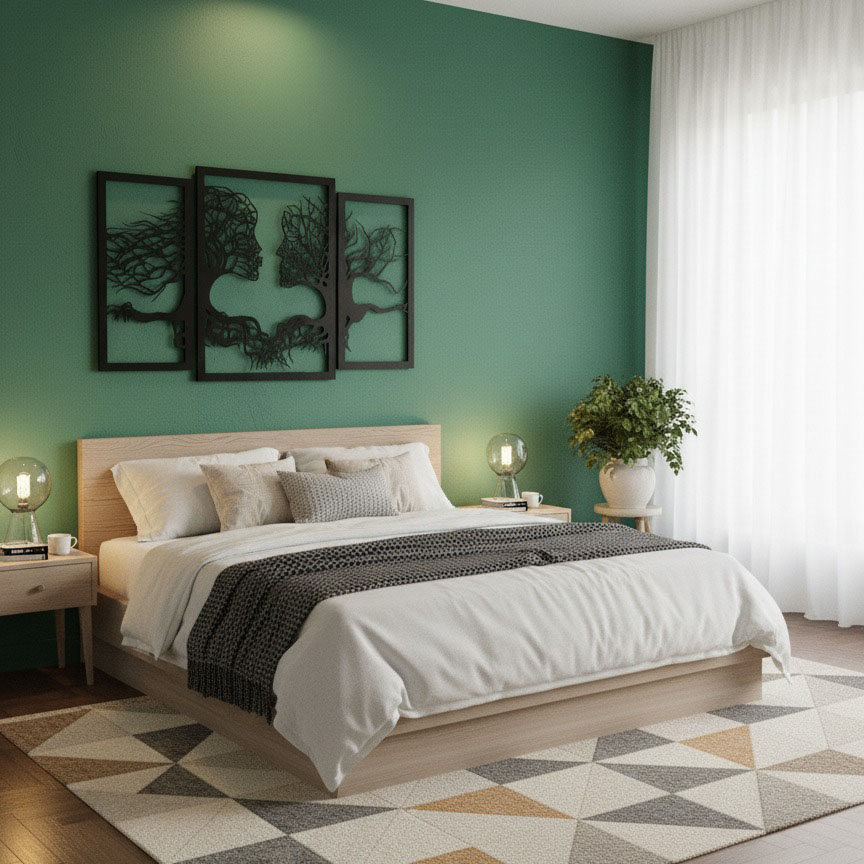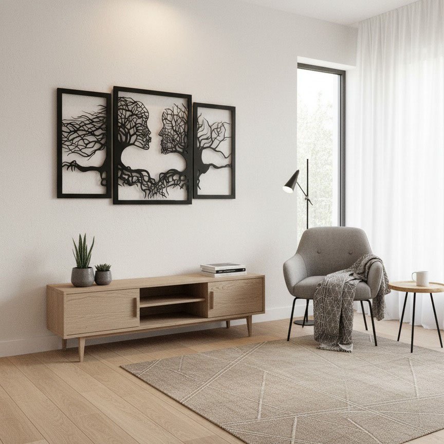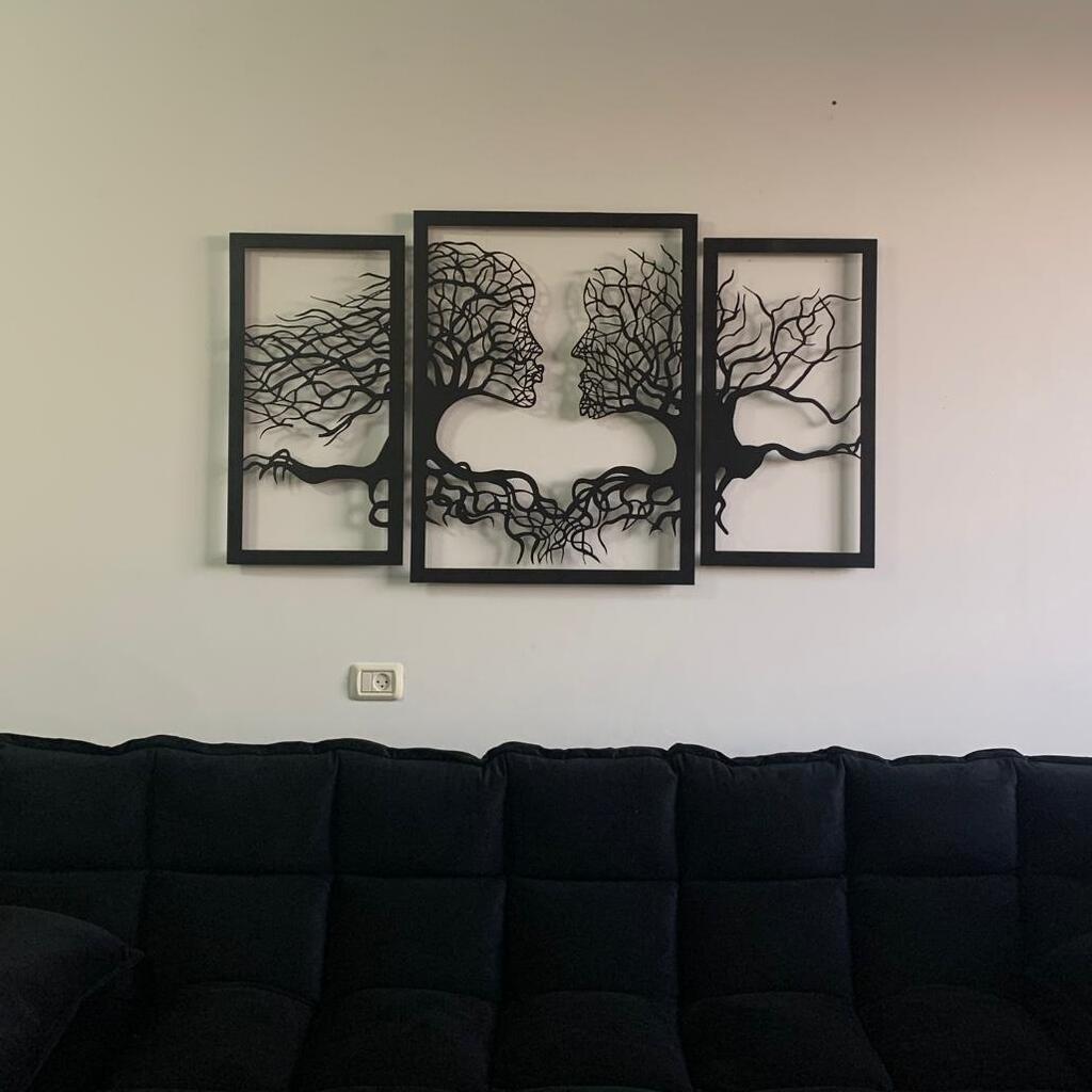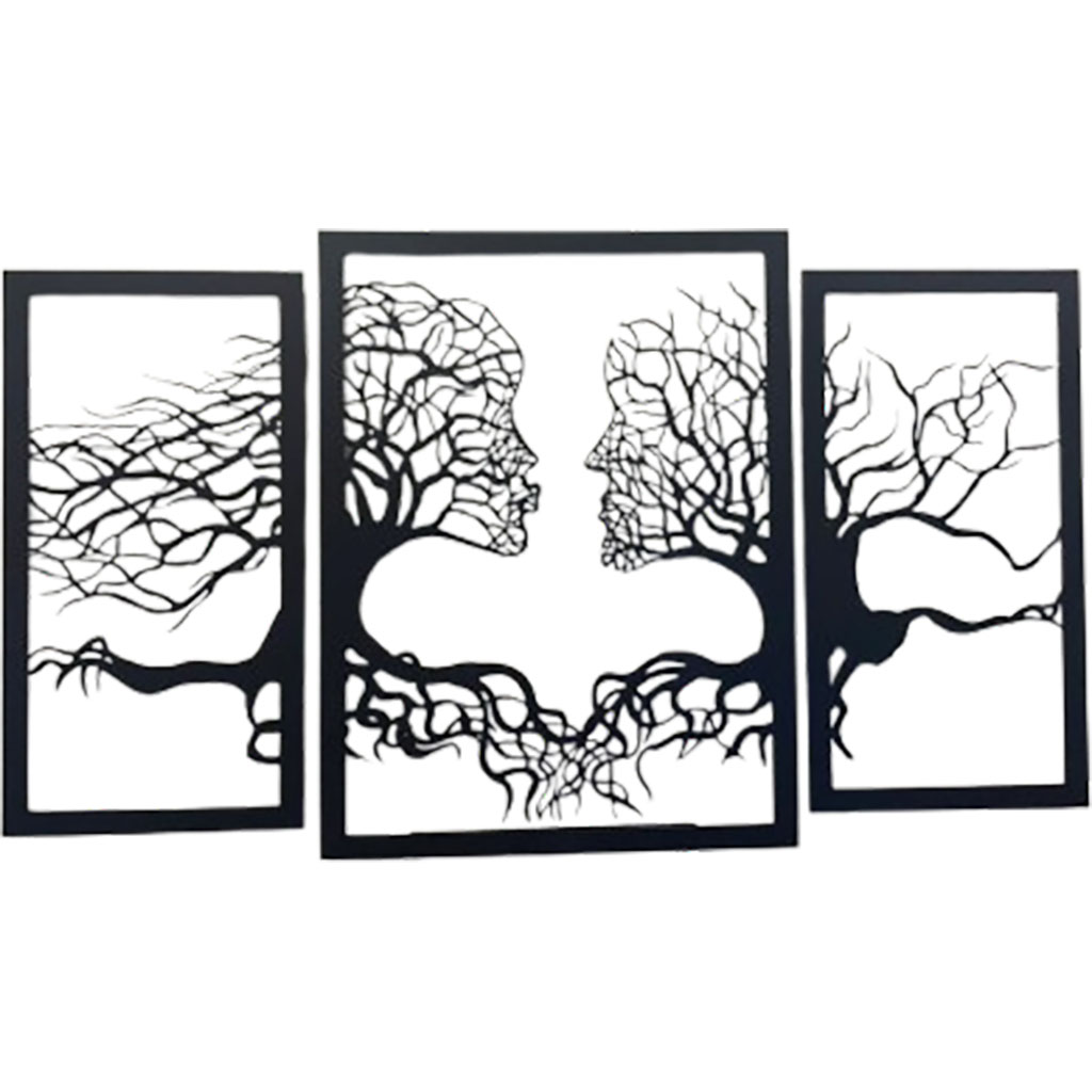 יצירת קיר מרגשת ומעוצבת ממתכת בחיתוך CNC, המתארת זוג פנים המשתלבים בענפי ושורשי עצים. שילוב עוצמתי של טבע ואנושיות, שמסמל חיבור, אהבה ויציבות.