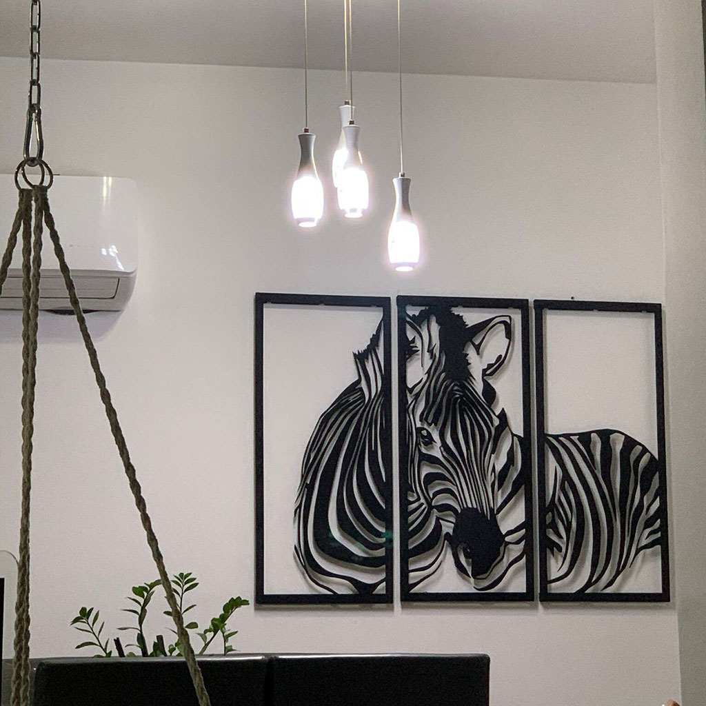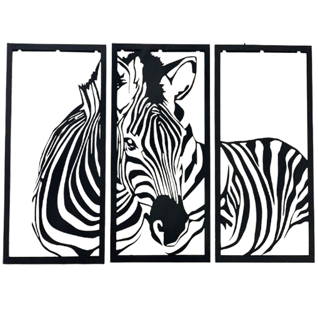 יצירת מתכת לקיר בעיצוב זברה ייחודי המורכבת משלושה חלקים נפרדים, כל אחד בגודל 33×75 ס"מ.